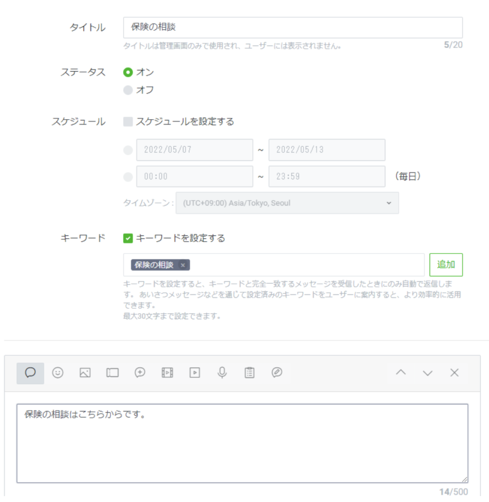 ユーザーが「保険の相談」とメッセージを送ってきたときに自動返信される例を紹介します。