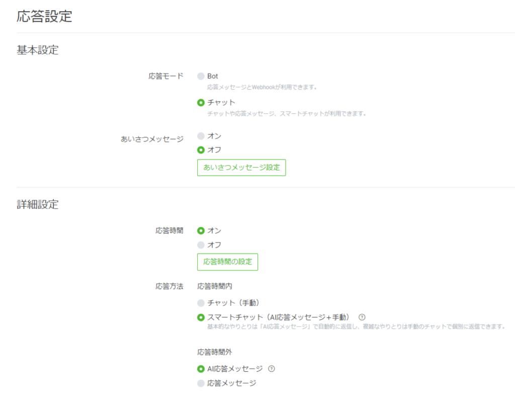 応答モードをチャットにします。応答方法から「スマートチャット」を選択し、営業時間外も「AI応答メッセージ」を選択します。