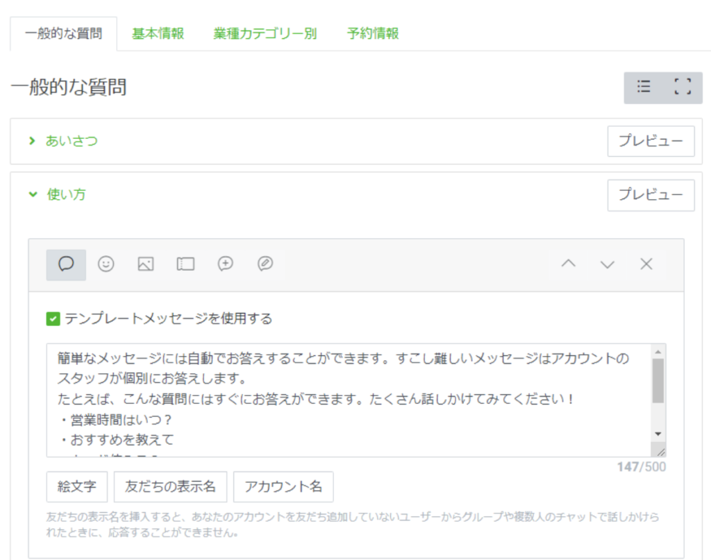 応答メッセージであれば、ユーザーからメッセージが来た時にどんな返答をするか、返信する時間帯や返信内容をあらかじめ設定することもできる便利な機能です。