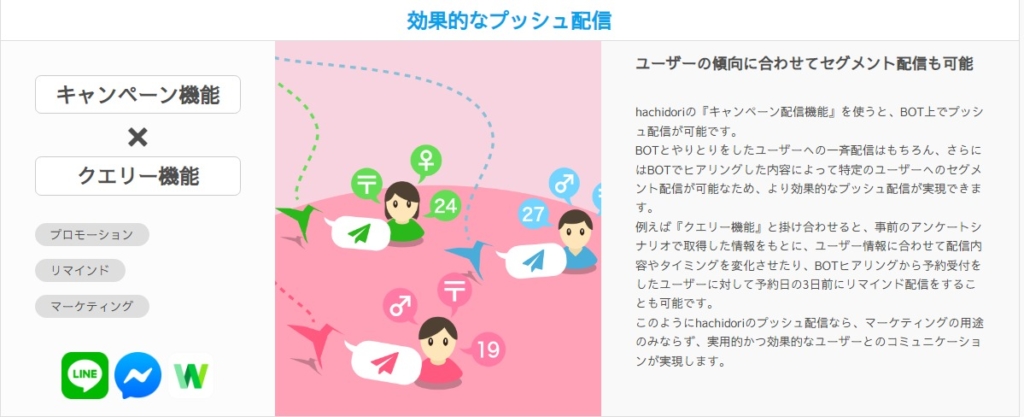 またLINE公式アカウントにチャットボットを導入している企業も多いですが、「hachidori」というチャットボットはやりとりをしたユーザーに「一斉配信」やBOTでヒヤリングした内容によって特定のユーザーに「セグメント配信」が行えるなど、非常に機能面が優れています。