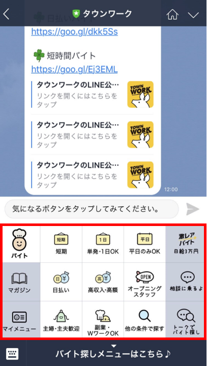 (バイト応募件数約80%増!リッチメニューを生かしたタウンワークのLINE活用事例|LINE for Business (linebiz.com) より引用)