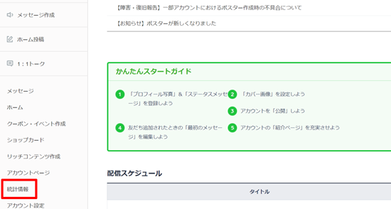 LINE公式アカウントの管理画面にある「統計情報」を選択すると、公式アカウントを友だちに追加した友だち数やブロックした友だち数を確認できます。