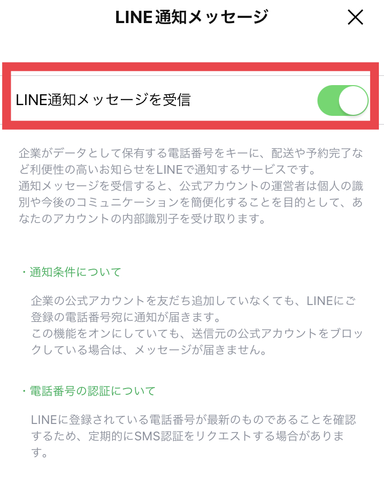 上記の画面の設定を切り替えれば、LINE通知メッセージが来ない設定に変更できますよ。