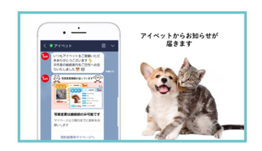 ペット保険に関するサービスを提供する「アイペット損害保険株式会社」は、通知メッセージで保険を継続する顧客向けに、郵送物の送付に関する連絡や、契約者向けに保険証のペットの写真を変更できるサービスと、変更可能な期限の通知を実施しています。