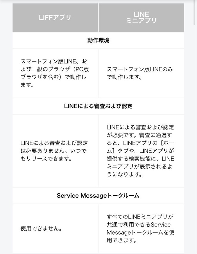 しかし、LINEミニアプリとは以下のような点がが違います。詳しくは下の図をご参照下さい。