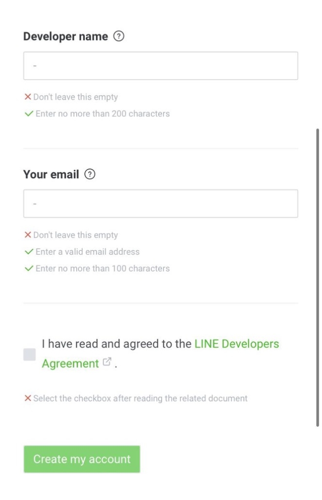 入力が完了して、赤いバツが全て緑色のチェックになればOKです。「Create my account」をクリックしてアカウントを登録してください。