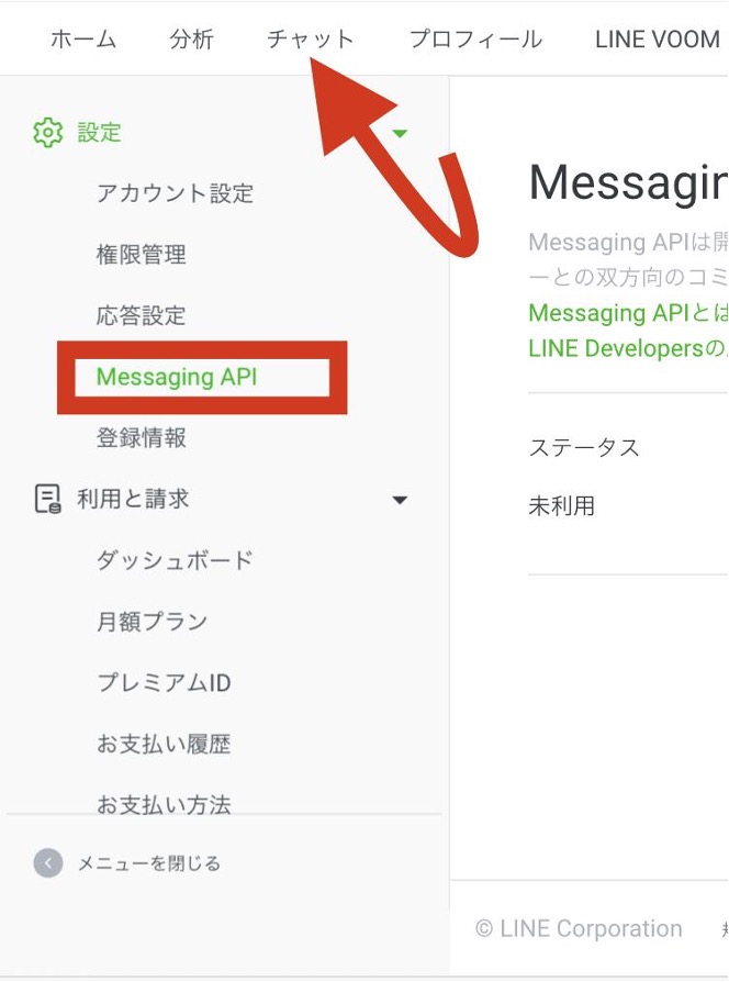 9.LINE公式アカウントにログインして、上のメニューバーより「チャット」を選択して、「設定」